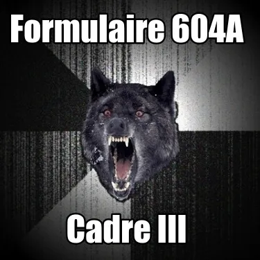 Make your own "Formulaire 604A Cadre III" meme with MemeCreator's free online meme generator. Add text, stickers, and drawings — then download or share. No watermark, no sign-up required.