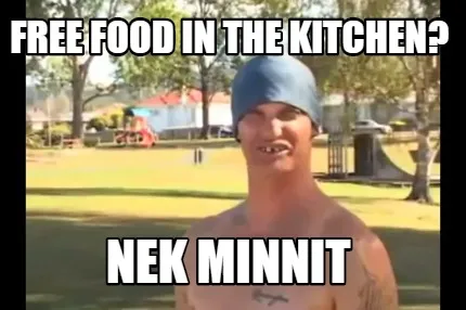 Make your own "Free food in the kitchen? Nek minnit" meme with MemeCreator's free online meme generator. Add text, stickers, and drawings — then download or share. No watermark, no sign-up required.