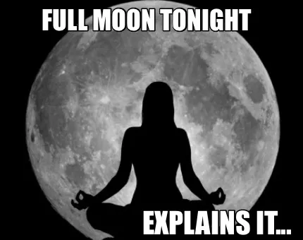 Make your own "Full moon tonight Explains it..." meme with MemeCreator's free online meme generator. Add text, stickers, and drawings — then download or share. No watermark, no sign-up required.