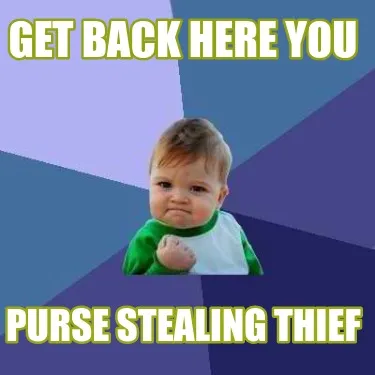 Make your own "Funny Get back here you Purse stealing thief" meme with MemeCreator's free online meme generator. Add text, stickers, and drawings — then download or share. No watermark, no sign-up required.