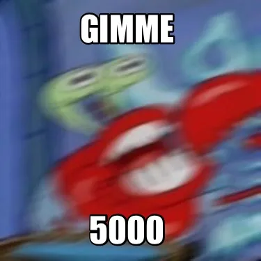 Make your own "Funny Gimme 5000" meme with MemeCreator's free online meme generator. Add text, stickers, and drawings — then download or share. No watermark, no sign-up required.