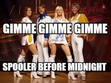 Make your own "Gimme gimme gimme spooler before midnight" meme with MemeCreator's free online meme generator. Add text, stickers, and drawings — then download or share. No watermark, no sign-up required.