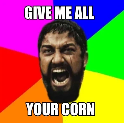 Make your own "Give me all your corn" meme with MemeCreator's free online meme generator. Add text, stickers, and drawings — then download or share. No watermark, no sign-up required.