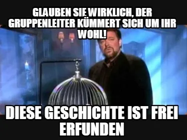 Make your own "Funny Glauben Sie wirklich, der Gruppenleiter kümmert sich um ihr Wohl! Diese Geschic" meme with MemeCreator's free online meme generator. Add text, stickers, and drawings — then download or share. No watermark, no sign-up required.