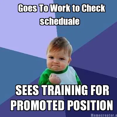 Create Funny Goes To Work to Check scheduale SEES TRAINING FOR PROMOTED POSITION Meme