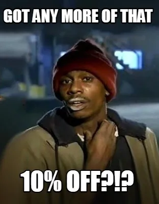 Make your own "Funny Got any more of that 10% off?!?" meme with MemeCreator's free online meme generator. Add text, stickers, and drawings — then download or share. No watermark, no sign-up required.