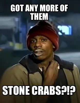 Make your own "Funny Got any more of them Stone crabs?!?" meme with MemeCreator's free online meme generator. Add text, stickers, and drawings — then download or share. No watermark, no sign-up required.