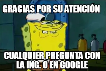 Make your own "Funny Gracias por su atención cualquier pregunta con la ING. O EN GOOGLE" meme with MemeCreator's free online meme generator. Add text, stickers, and drawings — then download or share. No watermark, no sign-up required.