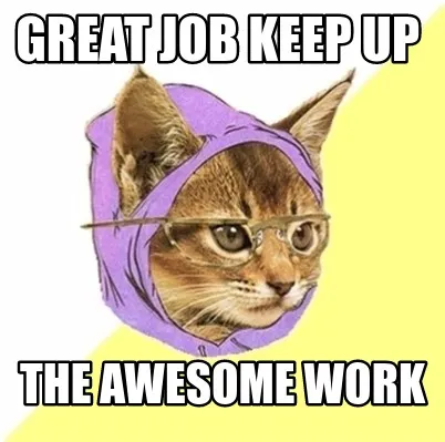 Make your own "Funny great job keep up the awesome work" meme with MemeCreator's free online meme generator. Add text, stickers, and drawings — then download or share. No watermark, no sign-up required.
