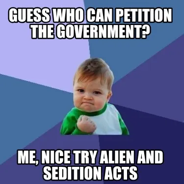 Funny Guess who can petition the government? Me, nice try Alien and Sedition acts Meme Template