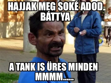 Make your own "Hajjak meg soké adod báttya A tank is üres minden mmmm……" meme with MemeCreator's free online meme generator. Add text, stickers, and drawings — then download or share. No watermark, no sign-up required.