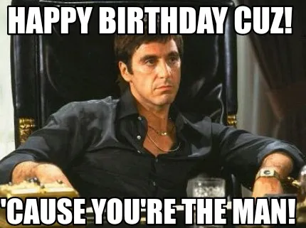 Make your own "Happy birthday cuz! 'Cause you're the Man!" meme with MemeCreator's free online meme generator. Add text, stickers, and drawings — then download or share. No watermark, no sign-up required.
