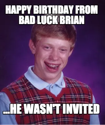 Make your own "Happy birthday from bad luck brian ...he wasn't invited" meme with MemeCreator's free online meme generator. Add text, stickers, and drawings — then download or share. No watermark, no sign-up required.