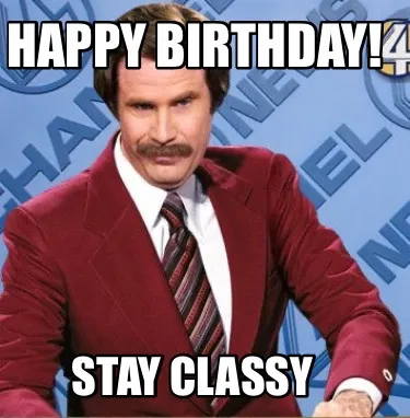 Make your own "Happy Birthday! Stay classy" meme with MemeCreator's free online meme generator. Add text, stickers, and drawings — then download or share. No watermark, no sign-up required.