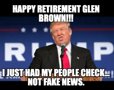 Make your own "Funny Happy retirement Glen Brown!!! I just had my people check... Not fake news." meme with MemeCreator's free online meme generator. Add text, stickers, and drawings — then download or share. No watermark, no sign-up required.