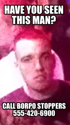 Make your own "Funny Have you seen this man? Call Borpo stoppers 555-420-6900" meme with MemeCreator's free online meme generator. Add text, stickers, and drawings — then download or share. No watermark, no sign-up required.