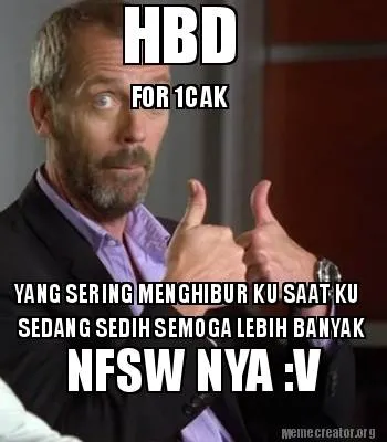 Make your own "Funny HBD FOR 1CAK YANG SERING MENGHIBUR KU SAAT KU SEDANG SEDIH SEMOGA LEBIH BANYAK" meme with MemeCreator's free online meme generator. Add text, stickers, and drawings — then download or share. No watermark, no sign-up required.