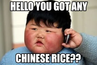 Make your own "Funny Hello you got any Chinese rice??" meme with MemeCreator's free online meme generator. Add text, stickers, and drawings — then download or share. No watermark, no sign-up required.