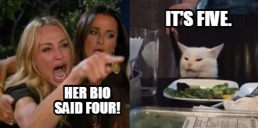 Make your own "Funny Her bio said four! It's five." meme with MemeCreator's free online meme generator. Add text, stickers, and drawings — then download or share. No watermark, no sign-up required.