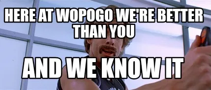 Make your own "Here at wopogo we're better than you And we know it" meme with MemeCreator's free online meme generator. Add text, stickers, and drawings — then download or share. No watermark, no sign-up required.