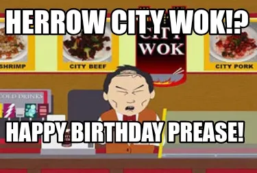 Make your own "Herrow city wok!? Happy birthday prease!" meme with MemeCreator's free online meme generator. Add text, stickers, and drawings — then download or share. No watermark, no sign-up required.