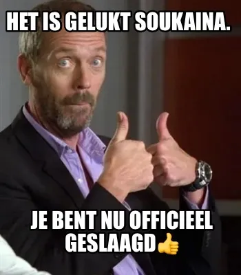 Make your own "Het is gelukt Soukaina. Je bent nu officieel geslaagd????" meme with MemeCreator's free online meme generator. Add text, stickers, and drawings — then download or share. No watermark, no sign-up required.