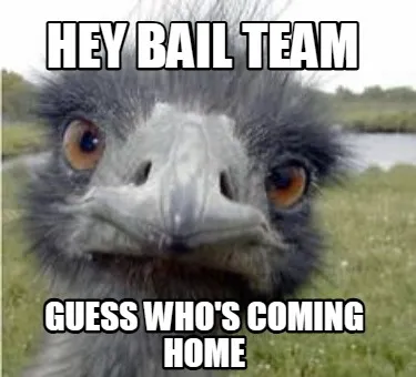 Make your own "Funny Hey Bail Team Guess WHo's coming home" meme with MemeCreator's free online meme generator. Add text, stickers, and drawings — then download or share. No watermark, no sign-up required.