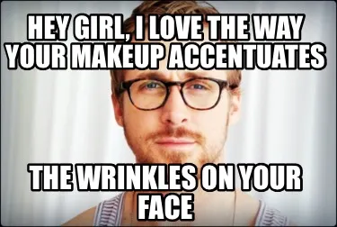 Make your own "Hey girl, I love the way your makeup accentuates The wrinkles on your face" meme with MemeCreator's free online meme generator. Add text, stickers, and drawings — then download or share. No watermark, no sign-up required.