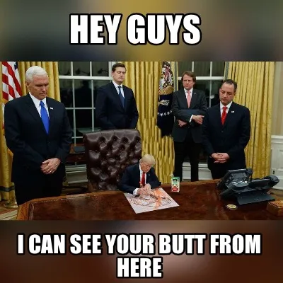 Make your own "Hey guys I can see your butt from here" meme with MemeCreator's free online meme generator. Add text, stickers, and drawings — then download or share. No watermark, no sign-up required.