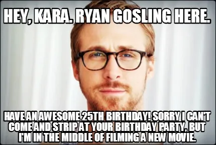 Create Hey, KARA. RYAN GOSLING HERE. HAVE AN AWESOME 25TH BIRTHDAY! sORRY i CAN'T COME Meme