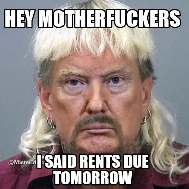 Make your own "HEY MOTHERFUCKERS I SAID RENTS DUE TOMORROW" meme with MemeCreator's free online meme generator. Add text, stickers, and drawings — then download or share. No watermark, no sign-up required.