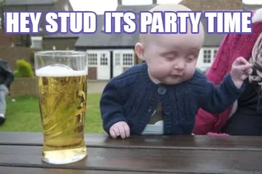 Make your own "Hey stud its party time" meme with MemeCreator's free online meme generator. Add text, stickers, and drawings — then download or share. No watermark, no sign-up required.