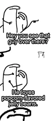 Make your own "Hey you see that guy over there? He loves popcorn-flavored jelly beans." meme with MemeCreator's free online meme generator. Add text, stickers, and drawings — then download or share. No watermark, no sign-up required.