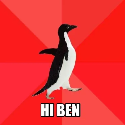 Make your own "Hi Ben" meme with MemeCreator's free online meme generator. Add text, stickers, and drawings — then download or share. No watermark, no sign-up required.
