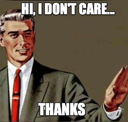 Make your own "Hi, I don't care... Thanks" meme with MemeCreator's free online meme generator. Add text, stickers, and drawings — then download or share. No watermark, no sign-up required.