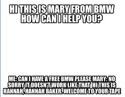 Create Hi This Is Mary From Bmw How Can I Help You Me Can I Have A Free Bmw Please Mary Meme