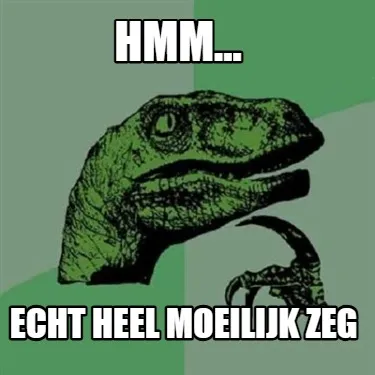Make your own "Hmm... echt heel moeilijk zeg" meme with MemeCreator's free online meme generator. Add text, stickers, and drawings — then download or share. No watermark, no sign-up required.