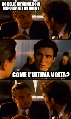 Make your own "Funny Ho delle informazioni importanti da darvi Come l'ultima volta?" meme with MemeCreator's free online meme generator. Add text, stickers, and drawings — then download or share. No watermark, no sign-up required.