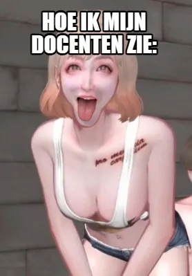 Make your own "Funny hoe ik mijn docenten zie:" meme with MemeCreator's free online meme generator. Add text, stickers, and drawings — then download or share. No watermark, no sign-up required.