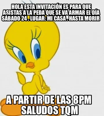 Create Funny HOLA ESTA INVITACIÓN ES PARA QUE ASISTAS A LA PEDA QUE SE VA ARMAR EL DÍA SÁB Meme
