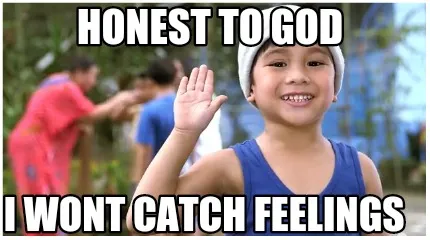 Make your own "Honest to god I wont catch feelings" meme with MemeCreator's free online meme generator. Add text, stickers, and drawings — then download or share. No watermark, no sign-up required.