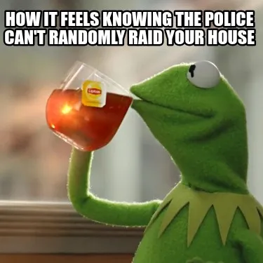 Make your own "Funny How it feels knowing the police can't randomly raid your house" meme with MemeCreator's free online meme generator. Add text, stickers, and drawings — then download or share. No watermark, no sign-up required.