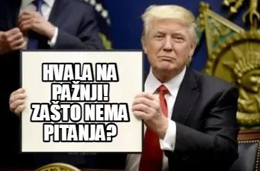 Make your own "Funny HVALA NA PAŽNJI! ZAŠTO NEMA PITANJA?" meme with MemeCreator's free online meme generator. Add text, stickers, and drawings — then download or share. No watermark, no sign-up required.