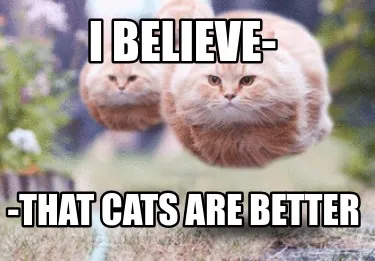 Make your own "Funny I believe- -that cats are better" meme with MemeCreator's free online meme generator. Add text, stickers, and drawings — then download or share. No watermark, no sign-up required.