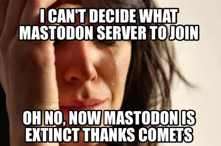 Create Funny I CAN'T DECIDE WHAT MASTODON SERVER TO JOIN OH NO, NOW MASTODON IS EXTINCT THANK Meme