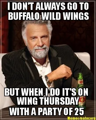 I DON'T ALWAYS GO TO BUFFALO WILD WINGS BUT WHEN I DO IT'S ON WING THURSDAY WITH Meme Template
