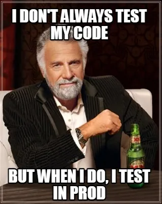 Make your own "I don't always test my code but when I do, I test in prod" meme with MemeCreator's free online meme generator. Add text, stickers, and drawings — then download or share. No watermark, no sign-up required.