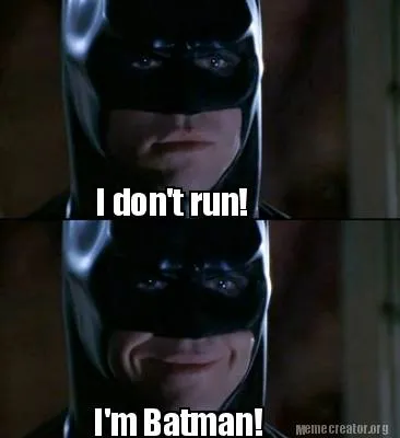 Make your own "Funny I don't run! I'm Batman!" meme with MemeCreator's free online meme generator. Add text, stickers, and drawings — then download or share. No watermark, no sign-up required.