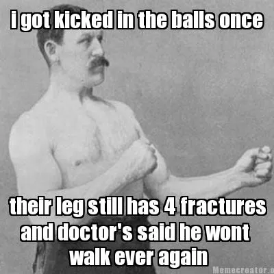 Make your own "I got kicked in the balls once their leg still has 4 fractures and doctor's sai" meme with MemeCreator's free online meme generator. Add text, stickers, and drawings — then download or share. No watermark, no sign-up required.