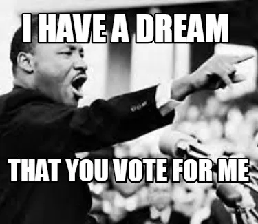 Make your own "I have a dream that you vote for me" meme with MemeCreator's free online meme generator. Add text, stickers, and drawings — then download or share. No watermark, no sign-up required.
